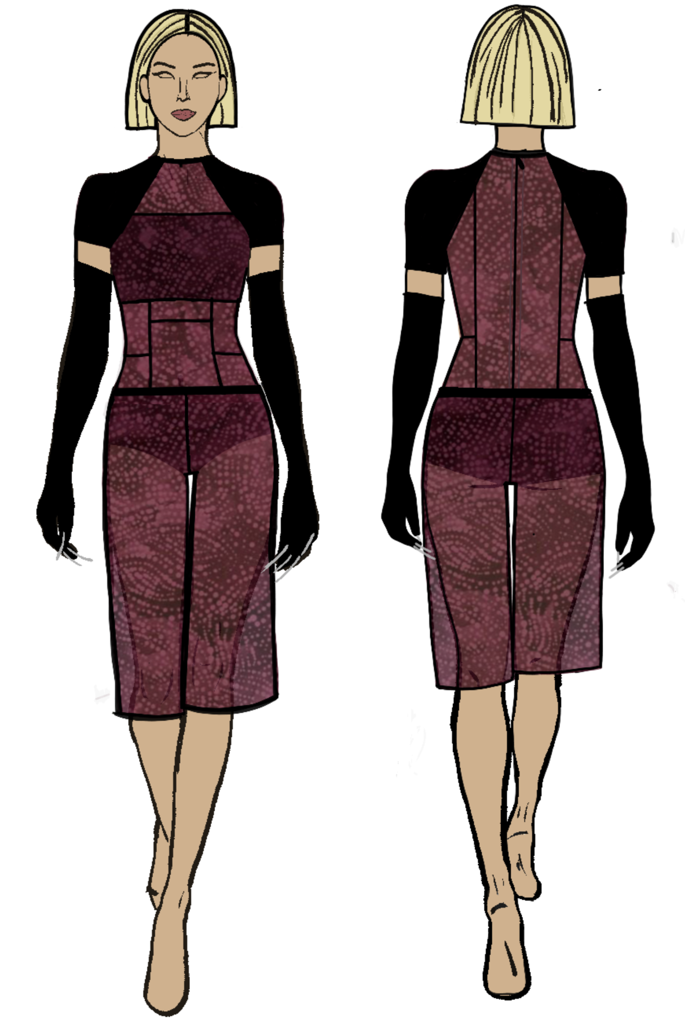 Abby knew she wanted to somehow draw attention to the hands; after workshopping a couple alternatives, we decided on long black gloves and silver acrylic nails and I attached them using E6000.